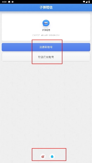 1、进入子弹短信页面后,可选择【注册新账号】创建账号,或点击【登录已有账号】进入登录流程,也可通过底部图标选择对应平台授权。