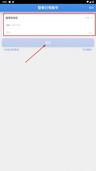 3、进入登录界面,选择相应的国家和地区,填写账号与密码后,点击【登录】按钮,即可完成账号登录流程。