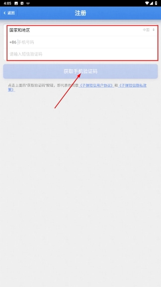 2、进入注册页面,先选择国家和地区,接着填写号码与短信验证码,然后点击【获取验证码】,以此完成信息验证环节。