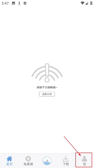 1、当出现“网络不太顺畅”的提示时,可点击【重新加载】按钮来尝试恢复网络连接,之后再点击底部导航栏的【我】按钮,进入个人相关操作页面。