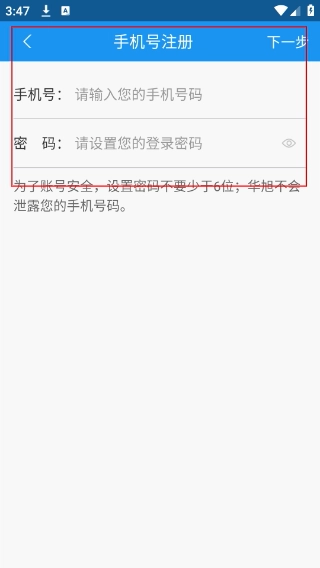 4、进入账号注册页面,输入账号,设置不少于6位的登录密码,完成信息填写后点击【下一步】按钮,推进账号注册流程。
