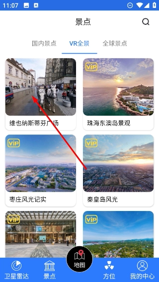 1、进入【卫星雷达】页面后,点击底部的【景点】按钮,就能切换到与景点相关的功能界面。
