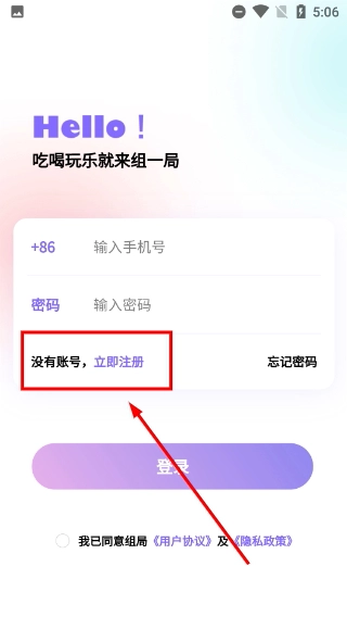 1、在“组一局”应用的服务协议弹窗里,阅读完相关条款后,点击【我同意】按钮,即可进入登录界面。