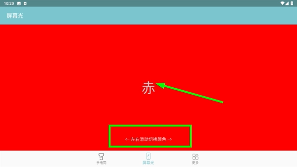 3、切换到屏幕光模式,当前背景显示为“赤”色,可利用【左右滑动切换颜色】的功能进行调整。