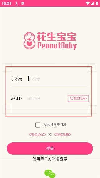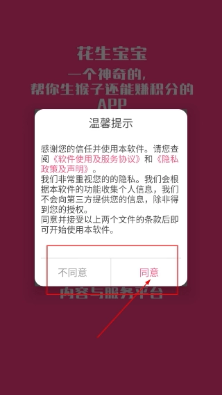 1、应用启动后会弹出温馨提示弹窗,点击【同意】按钮,即可进入“花生宝宝”首页。