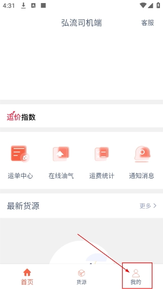 1、进入【弘流司机端】首页,能查看【运价指数】,底部的【我的】入口可用于后续操作。