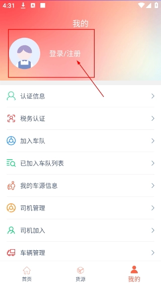 2、进入【我的】页面后,先找到顶部的【登录/注册】入口,此页面还设有【认证信息】-【我的车源信息】等后续操作选项。