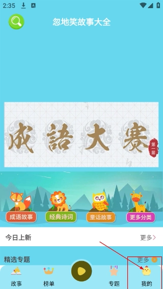 1、打开【忽地笑故事大全】的首页后,能参加【成语大赛】,还可以通过【成语故事】这类分类查找相关内容,点击页面底部的【我的】就能进入个人模块。