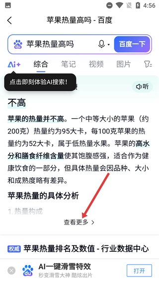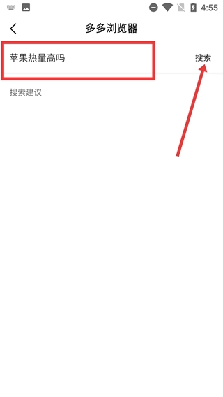 2、进入搜索页面后,在搜索框中输入想要查询的内容(例如“苹果热量高吗”),然后点击右侧的搜索按钮来进行搜索。