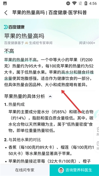 4、进入详细页面后,能查看苹果热量的具体分析内容,知晓其热量情况等相关信息。