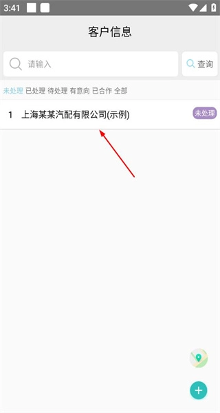 2、进入客户信息列表页面后,找到客户条目,点击“上海某汽配公司”这一条目,即可进入该客户的详情信息页面。