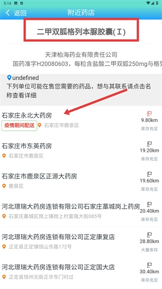 4、在搜索结果对应的附近药店页面,找到药品在售的药店列表,点击目标药店的名称(例如“石家庄永北大药房”),就能查看该药店的详细信息。