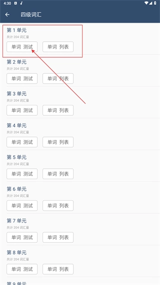 2、在四级词汇的单元页面中,选定目标单元后,点击【单词测试】按钮,即可进入该单元的词汇测试环节。