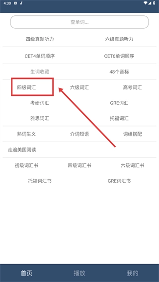 1、在词汇选择页面,点击【四级词汇-分类选项】,即可进入四级词汇的单元列表界面。