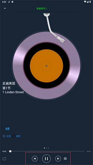 4、进入听力播放页面后,能够收听到“走遍美国”等学习内容,还可以借助【暂停】【调速】等功能来调节听力学习的节奏。