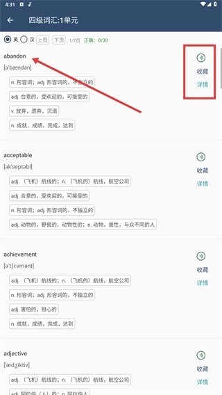 3、在词汇测试页面,你可以选择与单词对应的释义来完成作答,还能点击【收藏】或【详情】按钮,对单词进行标记或查看其相关信息。