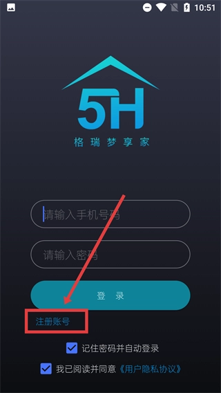 2、进入【格瑞梦享家】登录页面,可在【请输入号码】和【请输入密码】处填写信息进行登录;若尚未注册,需点击【注册账号】按钮并勾选相关协议。