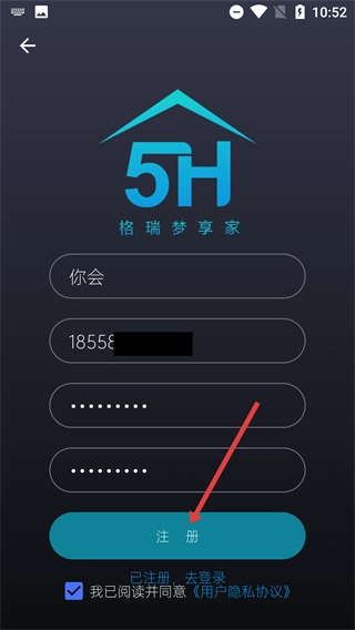 3、在【格瑞梦享家】的注册页面,填写好相应信息后,点击【注册】按钮即可完成账号注册;若已是注册用户,可选择【已注册-去登录】选项切换到登录页面。