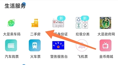 1、从底部菜单栏进入大足生活通的便民服务板块,点击里面的二手房选项;