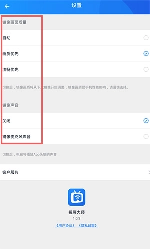 5、点击“我的”,可对镜像画面的质量、声音等参数进行设置。