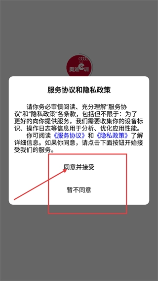 在使用【奥迪训】相关服务前,您需要先阅读【服务协议】与【隐私政策】,点击【同意并接受】按钮后,就能继续使用该服务。