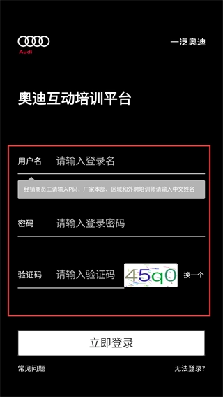 2、在【奥迪互动培训平台】的登录页面,经销商员工要把【P码】当作用户名输入,其他人员则输入中文姓名,接着填写密码和验证码,之后点击登录按钮。