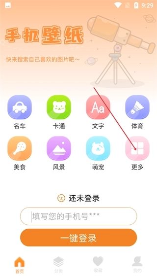 1、进入【手机壁纸】页面后,你可以选择【名车】【卡通】这类分类,也能点击【更多】查看所有分类,不过要先完成登录才能使用这些功能。