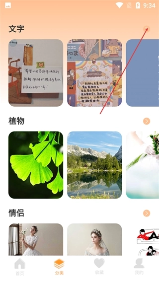 2、在分类页面,选择【文字】分类即可查看对应的壁纸内容,点击分类右侧的箭头还能加载更多同类型的壁纸资源。