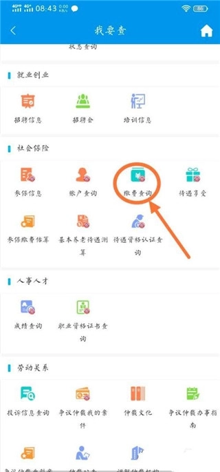 2、进入首页界面后,在页面中找到“我要查”或“社会保险”这两个项目中的任意一个,点击该项目进入对应的页面。