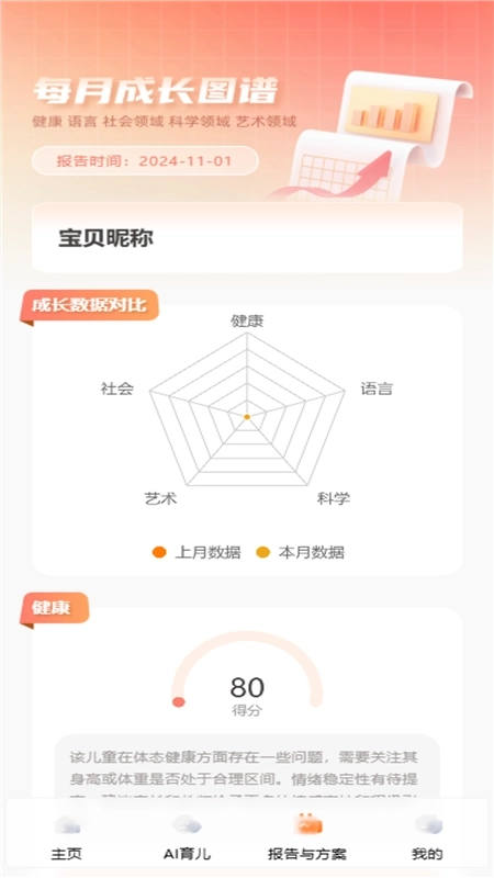 通过分析宝宝的互动数据来开展成长评估,并绘制成长图谱,以此全方位呈现孩子的成长状态。