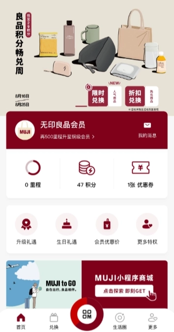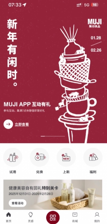 无印良品推出的muji是集购物与生活体验于一体的平台,其前身为MUJI passport。用户可以通过muji浏览并购买全品类商品,平台按“材、居、衣、愈、途”五大分类设置,方便快速查找所需物品;同时支持线上下单后到门店自提,也能查询线下门店的商品库存情况。在服务方面,muji涵盖会员积分的累积与兑换、专属优惠券的领取、门店打卡互动等功能,用户还可以在平台上查看生活美学相关的灵感内容。
