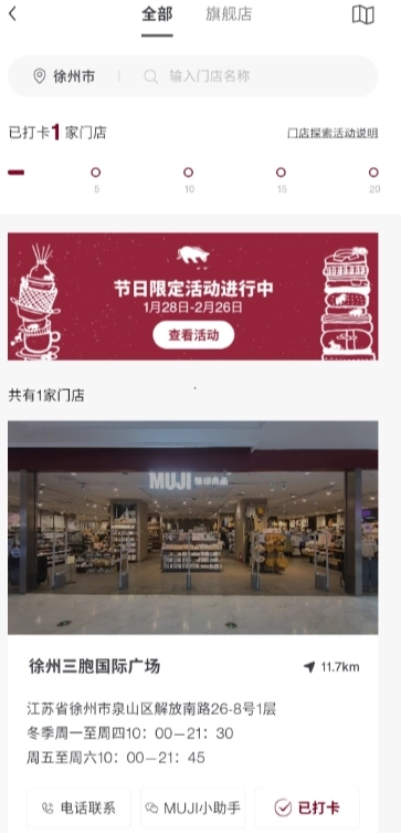 4、点击门店查询功能,系统会自动定位附近的门店,您可以查看商品库存情况,同时规划前往门店的路线,还能参与门店的打卡活动。