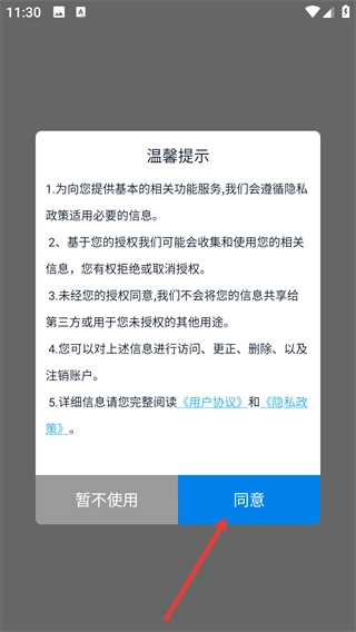 1、打开应用后若弹出【温馨提示】弹窗,请先仔细阅读【用户协议】和【隐私政策】,之后可根据自身需求选择【暂不使用】或【同意】以继续后续操作。