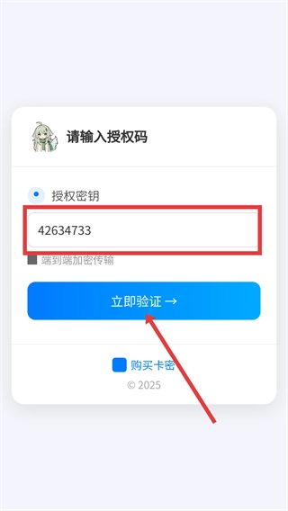 2、进入【授权码验证】界面后,首先在【授权密钥】输入框中填写内容(示例为42634733),若没有密钥,可点击【购买卡密】获取后再进行验证。