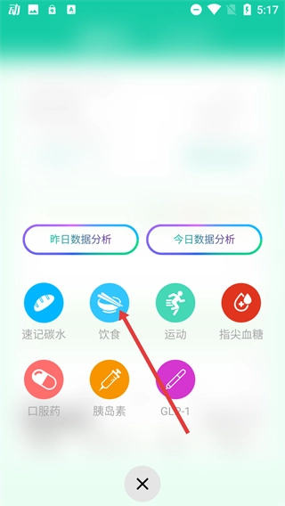 1、在血糖监测页面点击底部的【+】按钮,即可打开功能选择界面,在此界面中能够进行饮食、运动等健康数据的记录操作。