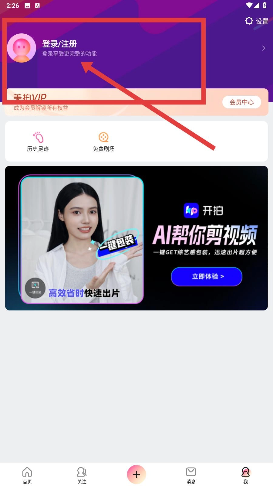 3、进入个人中心页面后,点击登录或注册区域,按照指引选择登录方式,完成登录或注册操作,登录后就能使用美拍的发布作品、互动等功能。