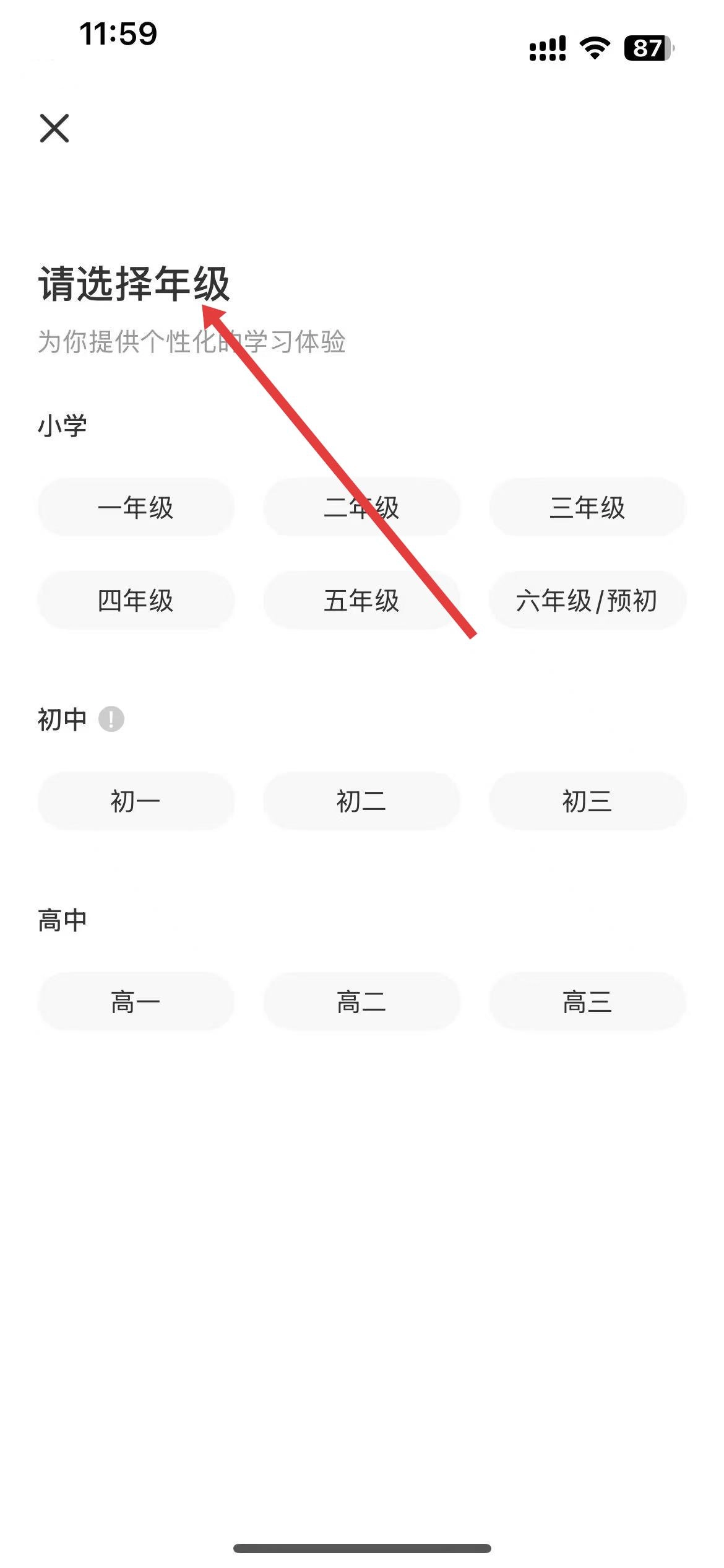 1、年级选择界面,支持选择小学、初中、高中各学段的不同年级,以此获取个性化学习内容。
