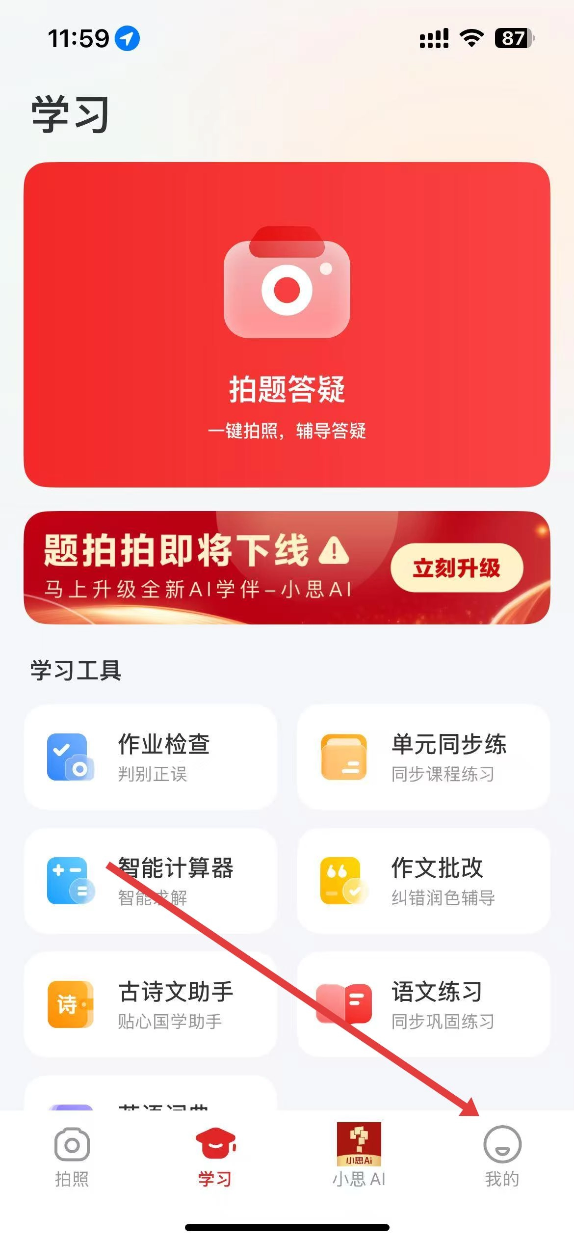 1、后打开进入,在进入后点击首页中间的拍照搜题。