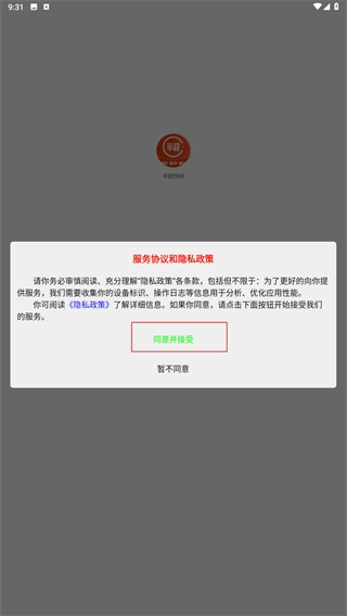1、仔细阅读【服务协议和隐私政策】后,点击【同意并接受】按钮,即可进入【辛超快修】应用的主流程。