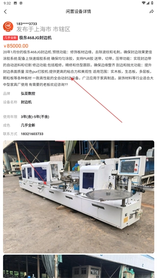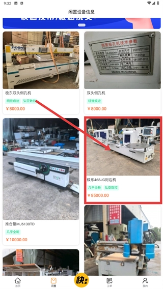 3、在闲置设备列表中,找到并点击目标设备(例如【极东468JG封边机】),即可进入该设备的详情页面。