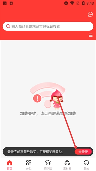 2、当主界面出现“加载失败”提示时,可点击屏幕尝试重新加载;若需登录,也可点击底部的【去登录】按钮进入登录页面。