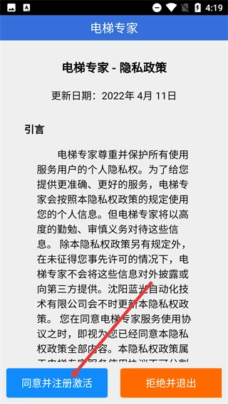 在使用【电梯专家】前,请先阅读其【隐私政策】,了解信息保护相关规则,之后点击【同意并注册激活】按钮,完成注册并使用该服务。