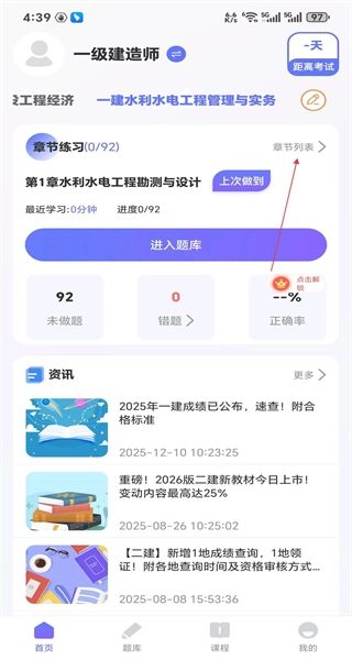 1、打开一级建造师题库,进入首页后,点击章节列表选项,就能进入对应的章节列表页面。