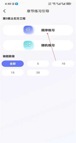 3、在章节练习的引导界面,选择“顺序练习”模式,并且将做题数量设置为“全部”,随后进入具体的练习环节。