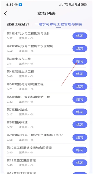 2、进入章节列表界面后,找到第3章“土石方工程”,点击该章节对应的练习按钮,即可进入该章节的练习引导页面。