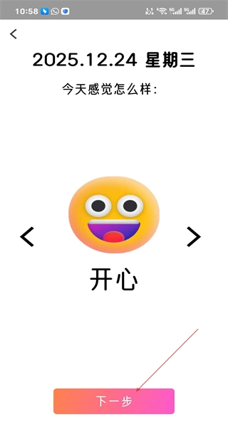 2、进入情绪选择页面,选定与“开心”对应的表情,确认后找到“下一步”按钮,点击该按钮即可进入情绪原因选择的相关页面。