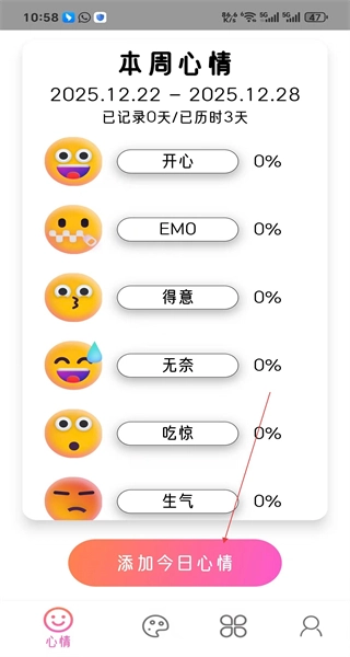 打开软件后,进入本周心情页面,能看到开心、EMO等情绪选项,找到“添加今日心情”按钮并点击,即可进入情绪选择页面。