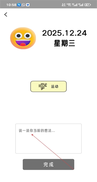 4、进入想法填写页面后,在输入框中写下当下的想法,确认内容无误后找到完成按钮,点击该按钮就能完成今日心情的记录。