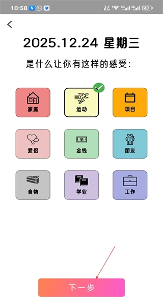 3、进入情绪原因选择页面后,能看到家庭运动等分类选项,选择运动分类,再点击下一步按钮,即可进入想法填写页面。