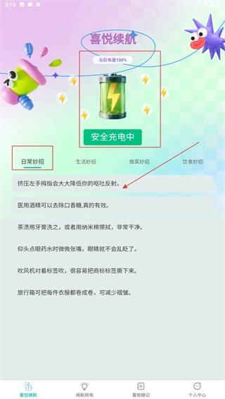 1、打开【喜悦续航】界面,能够查看设备的充电情况(比如当前电量显示100%),还可以浏览【日常妙招】这类生活技巧相关的内容。